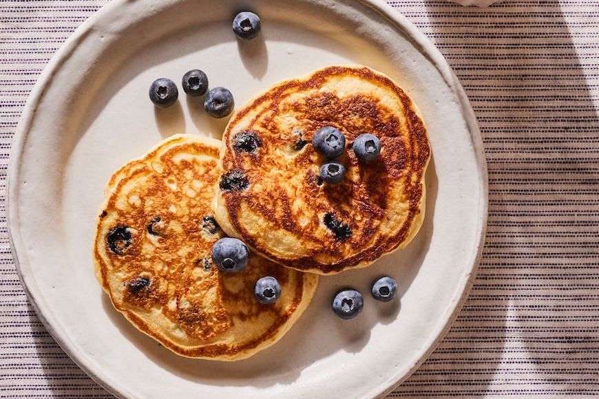 - Heat a large pan or griddle on medium heat and grease with butter. Pour about ¼ cup of the pancake mixture onto the griddle and top with 3-4 blueberries. Cook for 2-3 minutes on each side. Remove and transfer to a clean plate and repeat with the remaining batter.