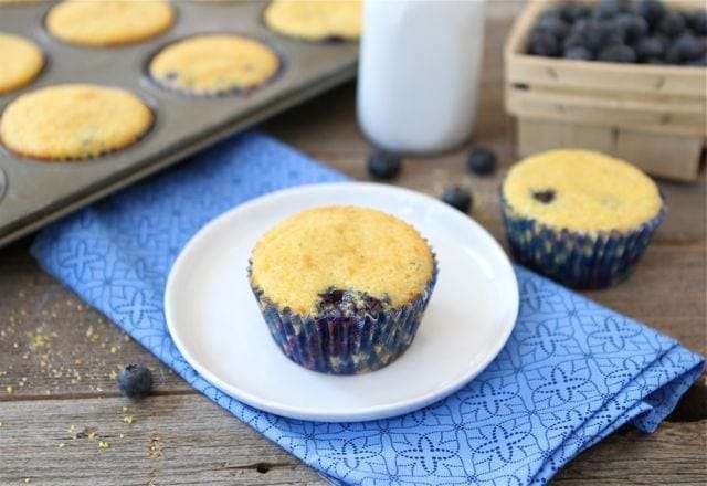 These tender corn muffins are bursting with blueberries. They are great for breakfast, a snack, or served as a side dish to any meal.