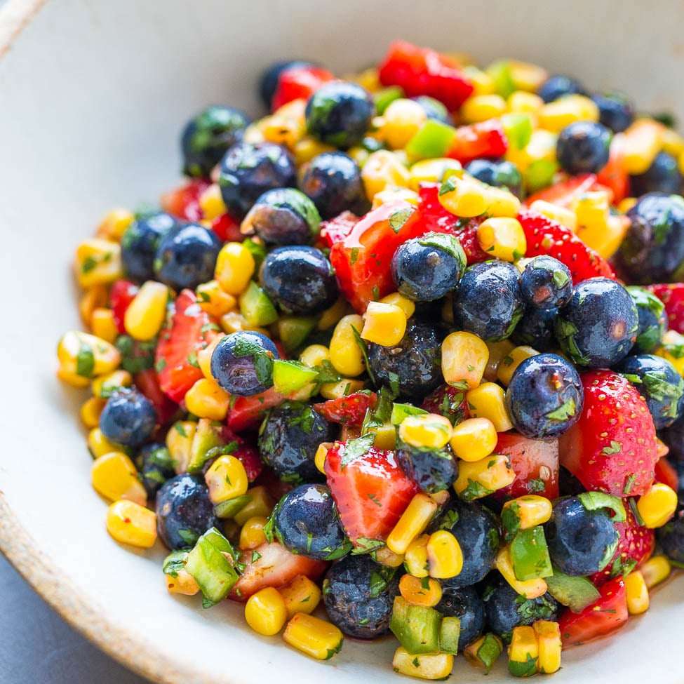 Berries, corn, jalapeno, cilantro, and more in this EASY and healthy salsa that's ready in 5 minutes!! So good you can eat it on its own!