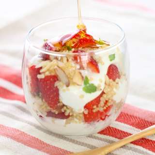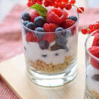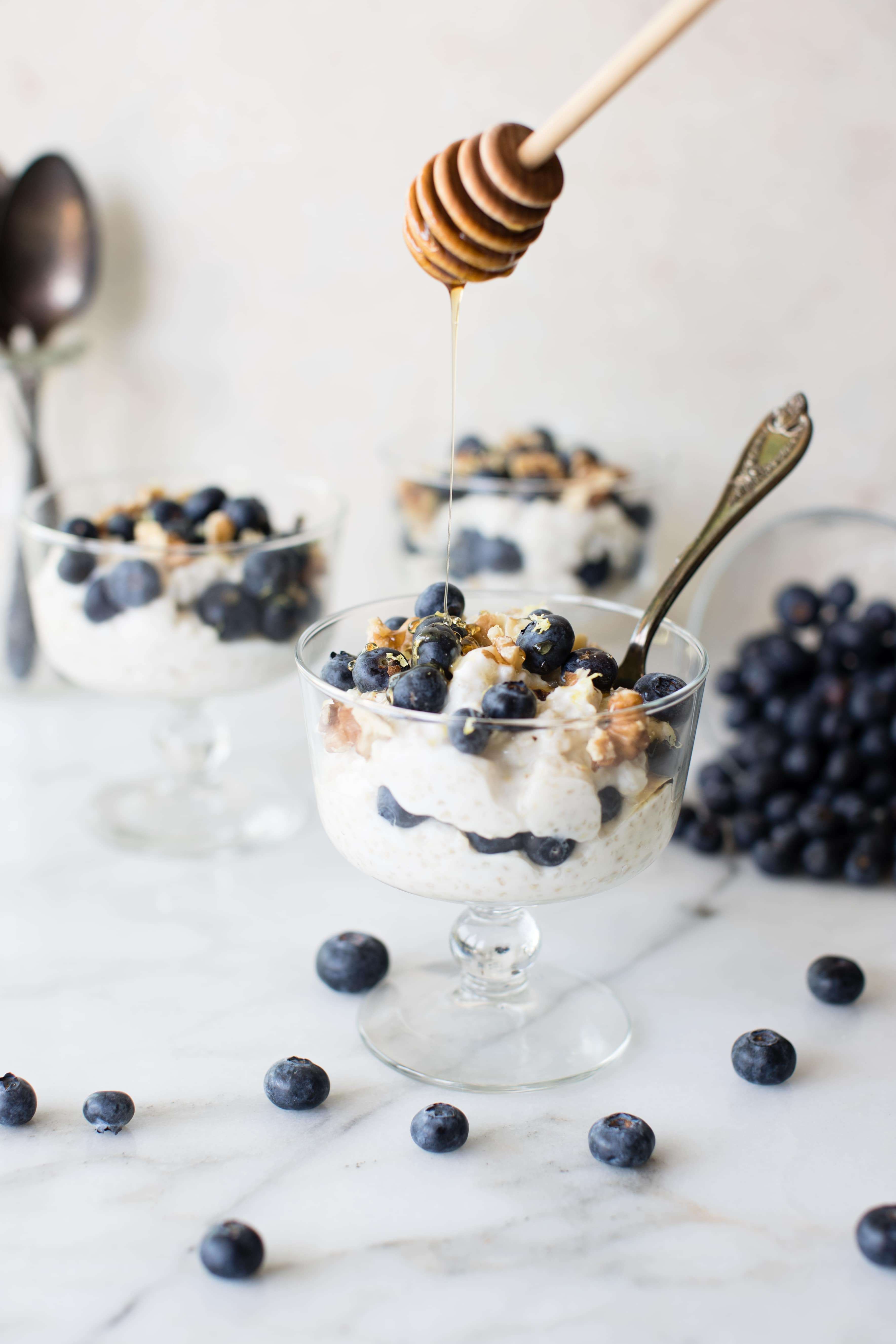 - Mix 2 cups quinoa to 2 cups yogurt together in a medium sized bowl. In a parfait glass, layer the quinoa & yogurt down first, then a layer of blueberries, another layer of quinoa & yogurt, and top with more blueberries, nuts and a drizzle of honey. Enjoy right away, or place in fridge to enjoy in the morning!