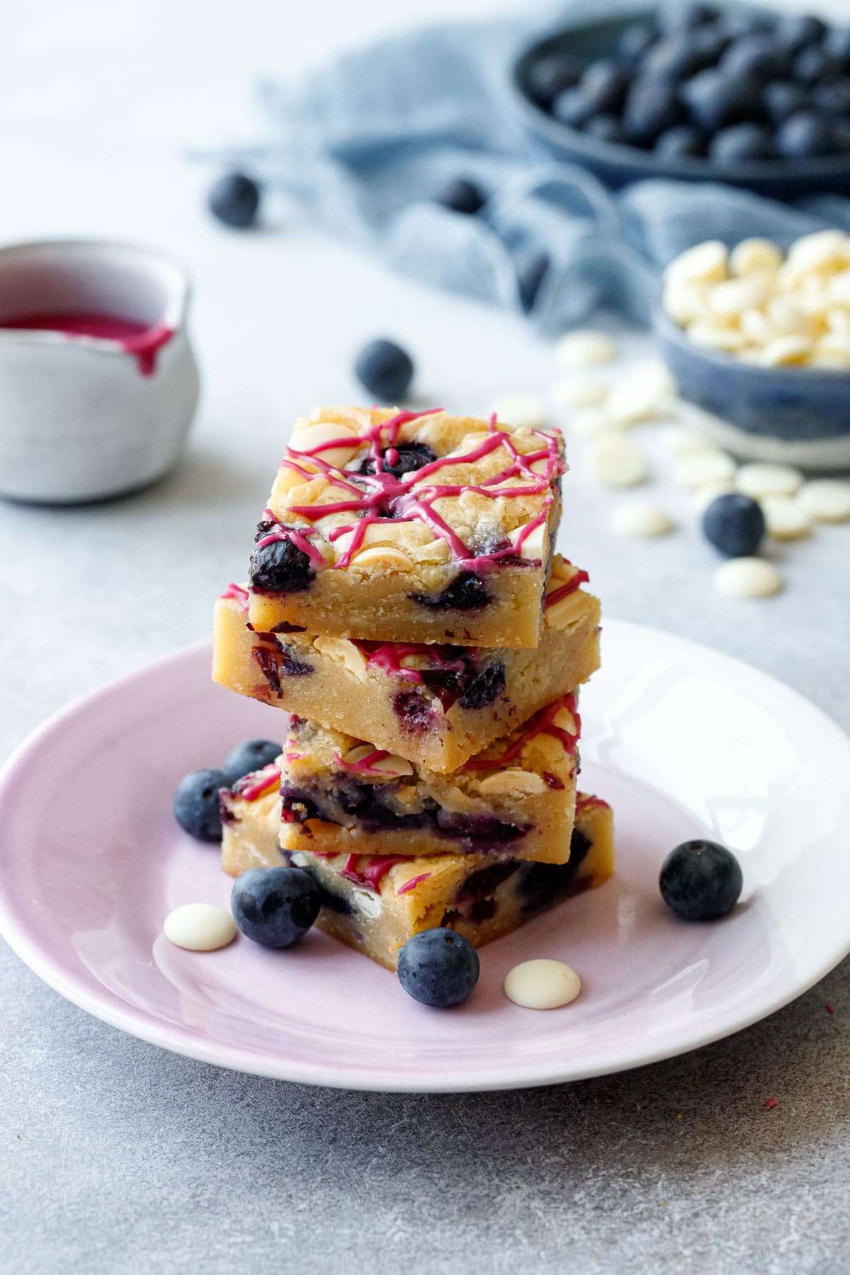 These white chocolate blueberry blondies are studded with chunks of white chocolate and pockets of soft, jammy blueberries and finished off with an artistic drizzle of blueberry maple glaze.