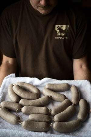 - Take out some hog casings — you’ll need about 3 to 4 standard lengths, about 10 feet — and set in a bowl of very warm water. Mix the eggs, cream, chives, sage and lemon zest in a bowl and put in the fridge.