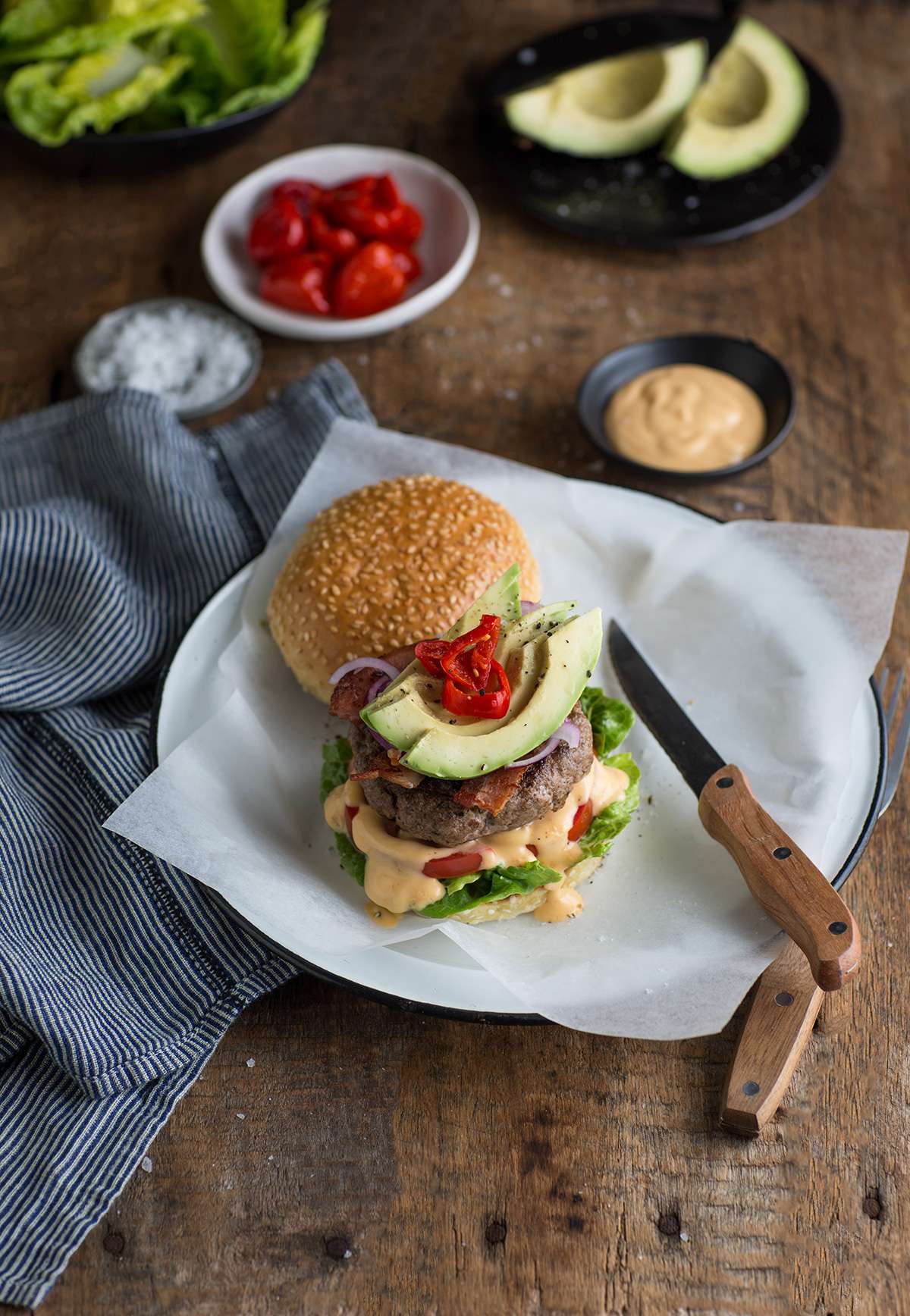 - Assemble the burger with lettuce, tomato and spicy mayonnaise. Top with the burger patty, bacon, red onion, sliced avocado and sliced peppadews.