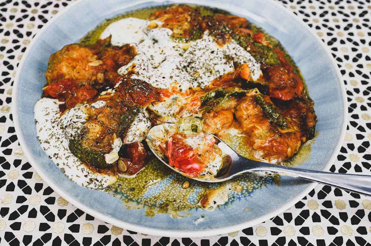 - Arrange the cooled zucchini/tomato mix on a serving platter and drizzle over all the yoghurt sauce. Generously sprinkle over the dried mint/dill and a little lemon juice along with a healthy glug of extra virgin olive oil.