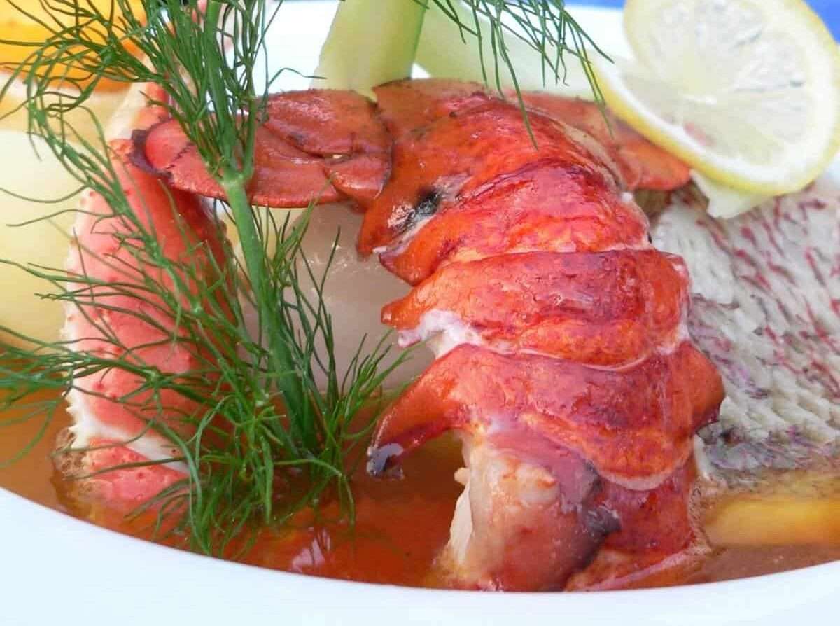 - Make crostini with stale baguette. Put the broth in a large sautoir and simmer gently. Delicately add the fish and lobster, fennel, potatoes and poach for about 10 minutes, depending on firmness of fish. Add crab legs at the end to reheat. Serve at once in a large soup bowl. Decorate with sprig of fennel, and a crostini with rouille.