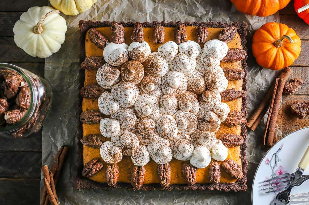 Light and airy pumpkin mousse, with a good splash of bourbon, in a rich chocolate cookie shell topped with whipped cream swirls and crunchy candied pecans.