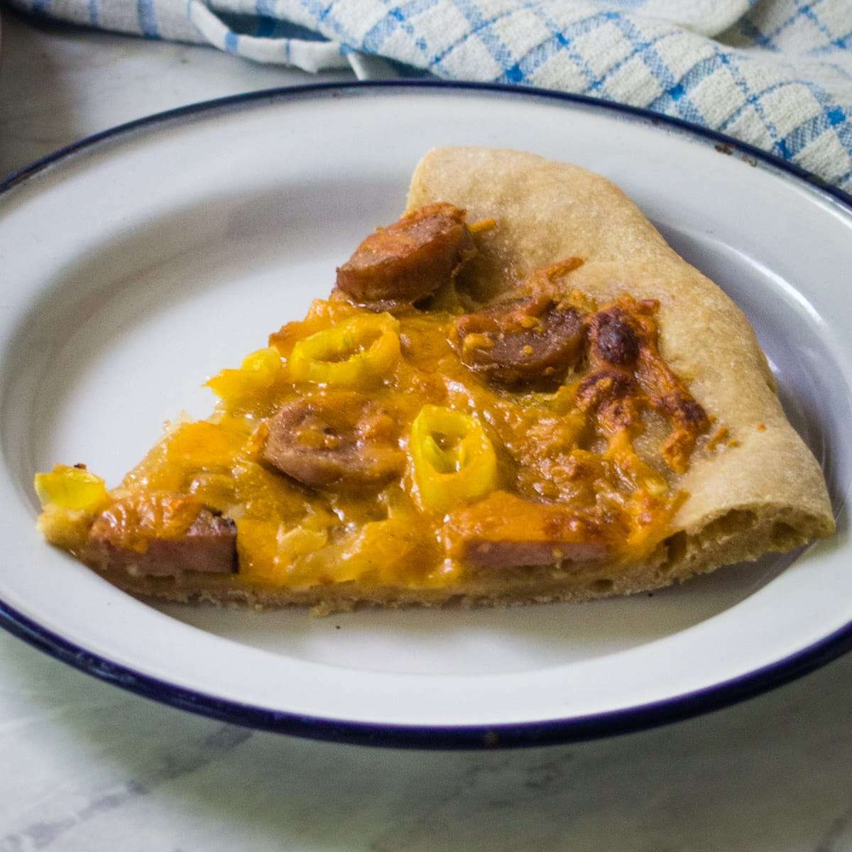 This easy bratwurst pizza is perfect for a game day meal or tailgating!