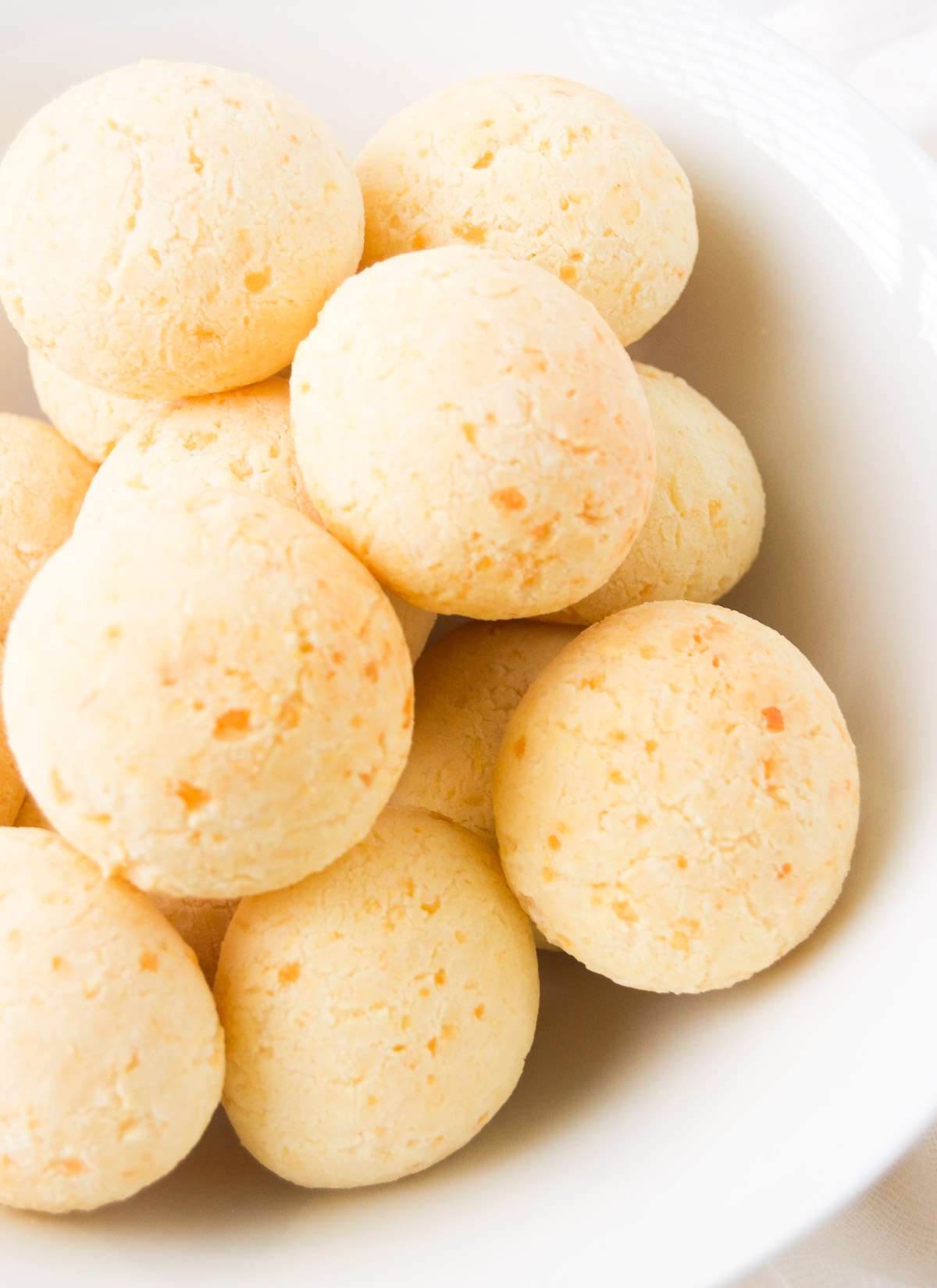 Brazilian cheese bread, or pão de queijo as we call them in Portuguese, are a true gift to the universe! This typical Brazilian snack is lightly crunchy on the outside, soft and chewy on the inside, and has a cheese flavor just hugs your mouth. This Brazilian cheese bread recipe is easy to make and yields about 30, so you can make a stash for now, and freeze the rest for later.