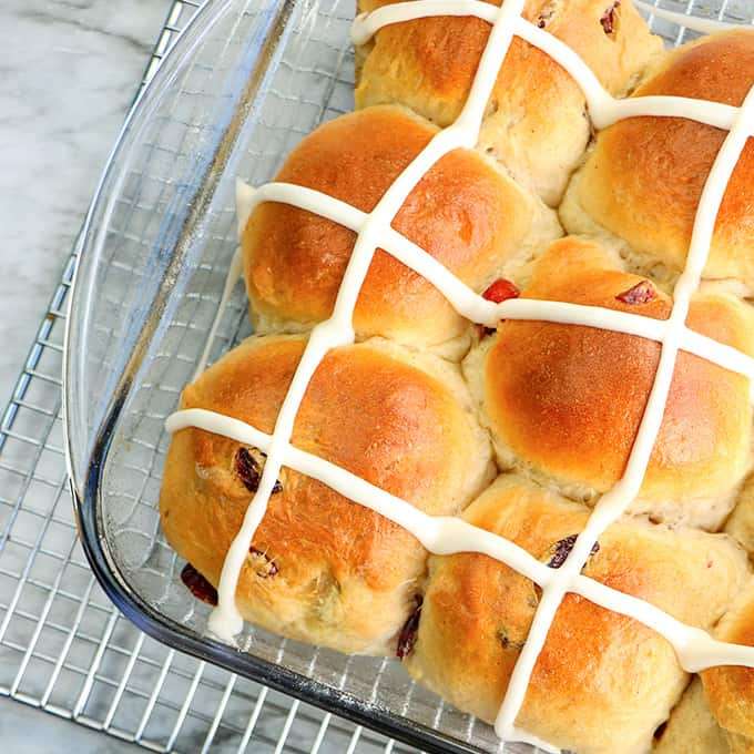 These Bread Machine Hot Cross Buns are a sweet dough spiced with cinnamon and studded with dried cranberries or raisins.