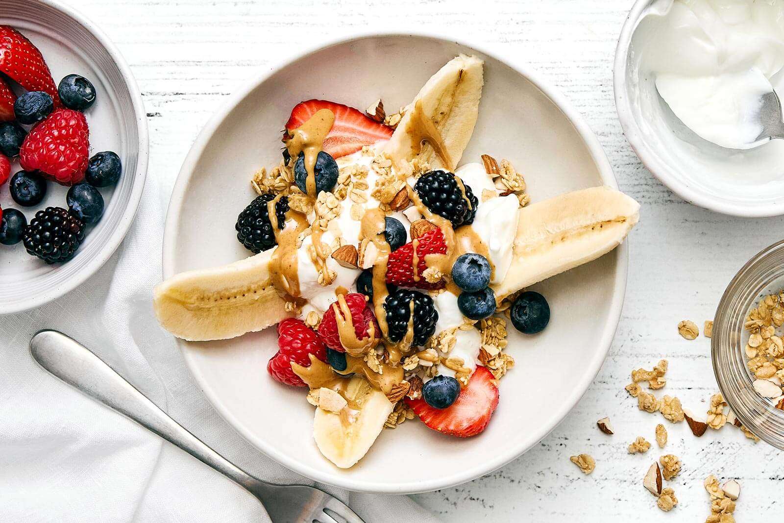 - Add toppings. Top the sliced bananas with yogurt, berries, and nuts, then enjoy!