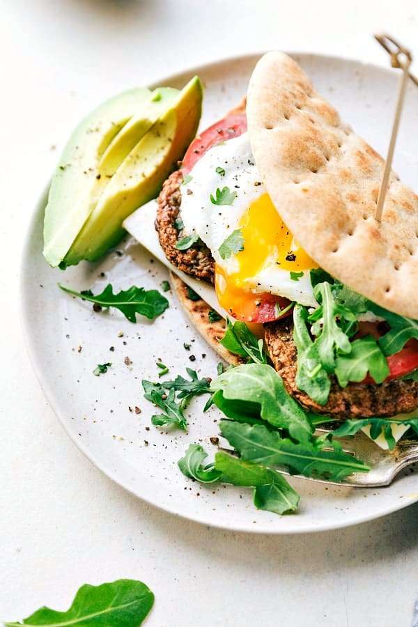 - Place one egg on top of the chicken sausages on each pita. Divide 3/4 cup arugula evenly between the two pitas. Slice 1 medium sized avocado and squeeze 1 lemon over the avocado. Place the avocado over the arugula and season with a pinch of salt and pepper.