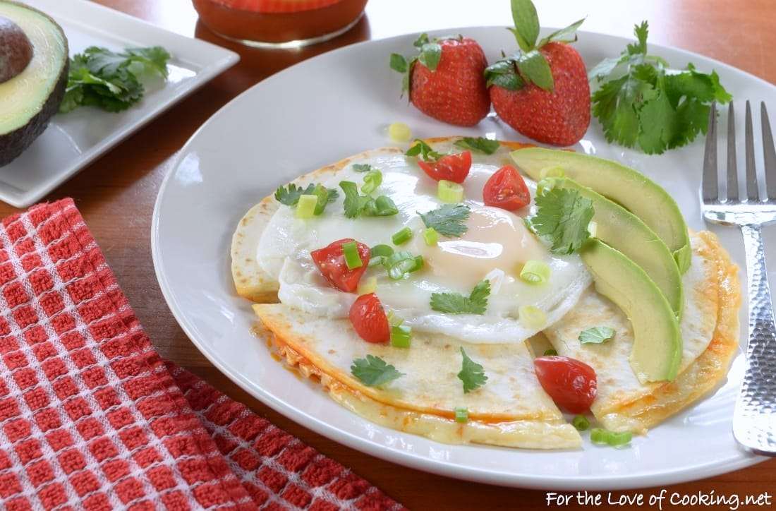 - Serve the steamed egg on top of the quesadilla then top with avocado slices, green onion, diced tomato, and fresh cilantro. Serve immediately. Enjoy.