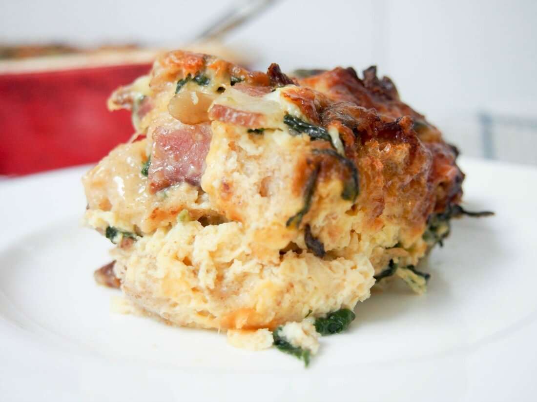 Packed with cheese & bacon, this breakfast strata is easy to prepare the night before for a delicious brunch/breakfast.