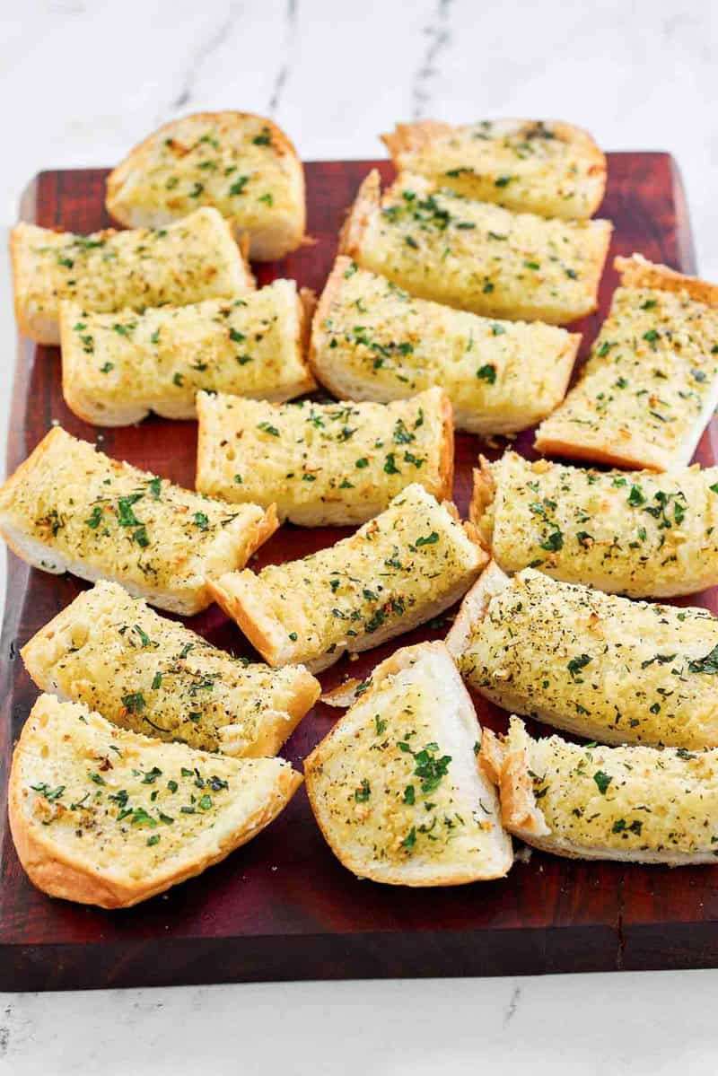- Cut the loaf of bread in half lengthwise. Spread the melted butter on the cut side and sprinkle with minced garlic, Parmesan, parsley, and oregano.