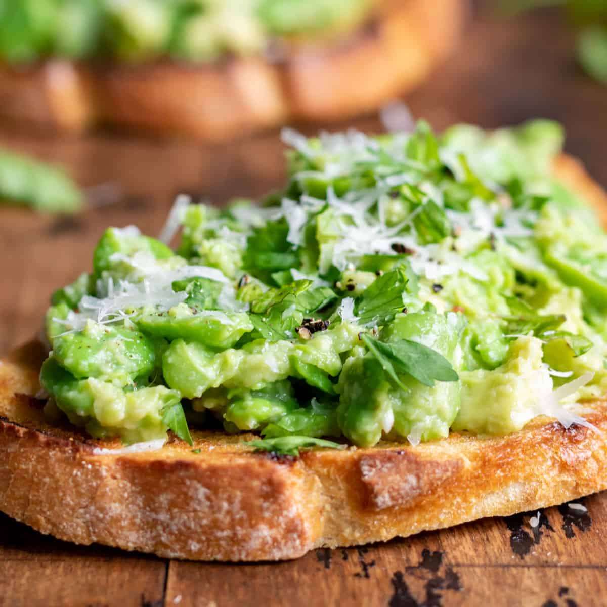 This Broad Bean Bruschetta recipe brings together mashed avocado, broad beans (fava beans), and fresh herbs, all piled onto garlic toast.