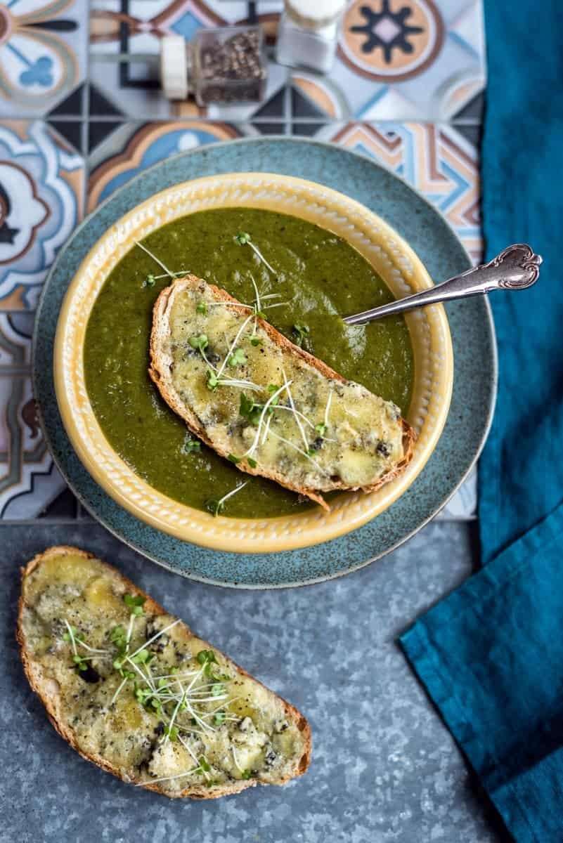 - Transfer to a blender and blitz until smooth. Season with a little black pepper. Don't worry if the soup is a bit bland as the Stilton toast is quite salty and will make up for it.
