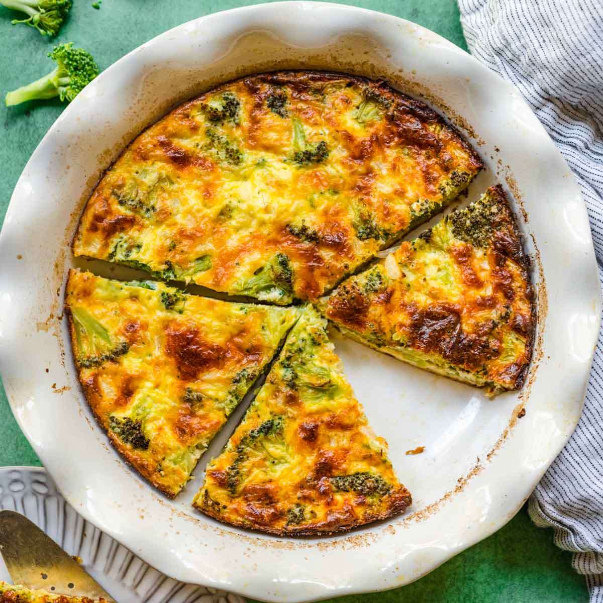 Broccoli Pie is the easiest cheesiest veggie casserole. Golden brown crustless quiche with broccoli florets, shredded cheddar cheese, eggs and biscuit mix.