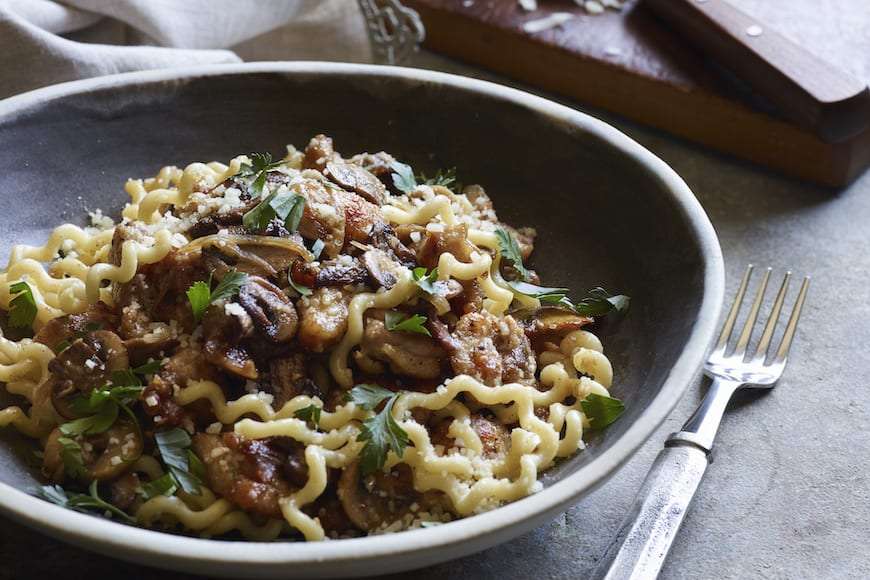 - Once the mushrooms and shallots are caramelized, add garlic and cook for 30 seconds until fragrant. Increase the heat to medium and add wine. Let the wine bubble and cook for 2-3 minutes. Add chicken and pasta both to the skillet, tossing multiple times to coat. Turn off heat and stir in grated cheese. Drizzle brown butter (make sure you get the brown bits!) over top, tossing to coat a few more times. Serve with additional cheese and chopped parsley.