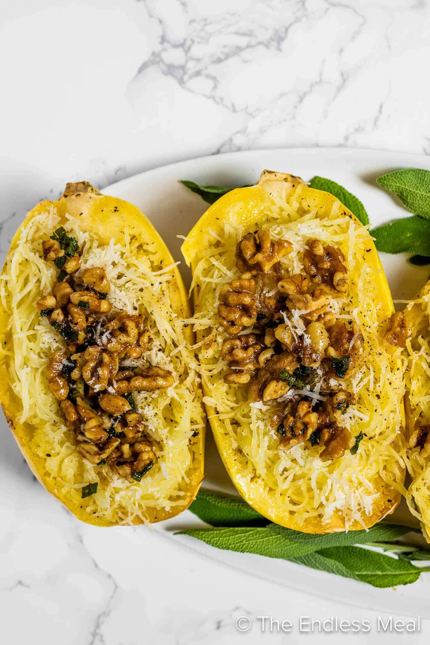 - Choose the 4 nicest looking squash shells and pile all the spaghetti squash strands in those 4 shells. Sprinkle the tops with parmesan cheese and then pour the butter over top.