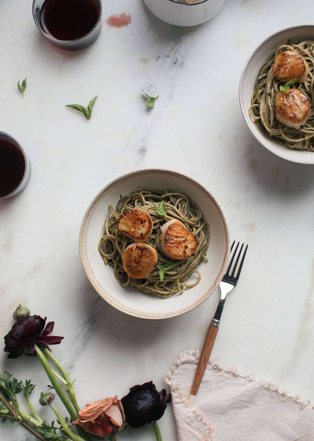 - Divide the pasta amongst to bowls. Top with the scallops and a few spoonfuls of the browned butter. Garnish with little basil leaves.