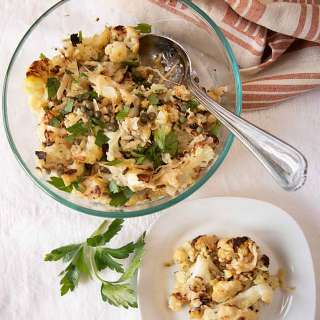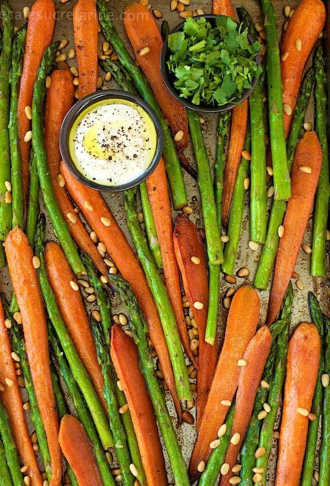 - After carrots have roasted for 15 minutes, remove from oven and gently stir. Add asparagus and rearrange to form a single layer as much as possible. Return to oven and roast for another 5 minutes or until asparagus is crisp tender. Remove from oven and transfer to a serving tray. Drizzle with any oil/spic mixture that's left on the pan. Scatter with pine nuts and serve hot with Lemon-Garlic Yogurt Sauce.