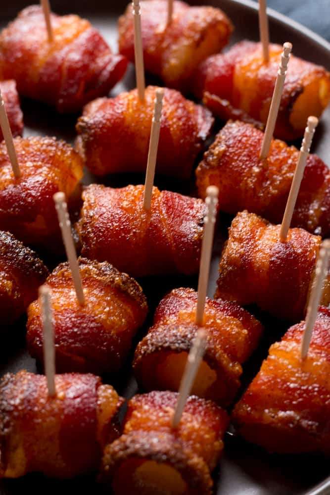 - Once cooked, take the pan out of the oven and carefully remove the bites from the rack with a set of tongs, making sure not to pull the bacon apart. Serve when hot!