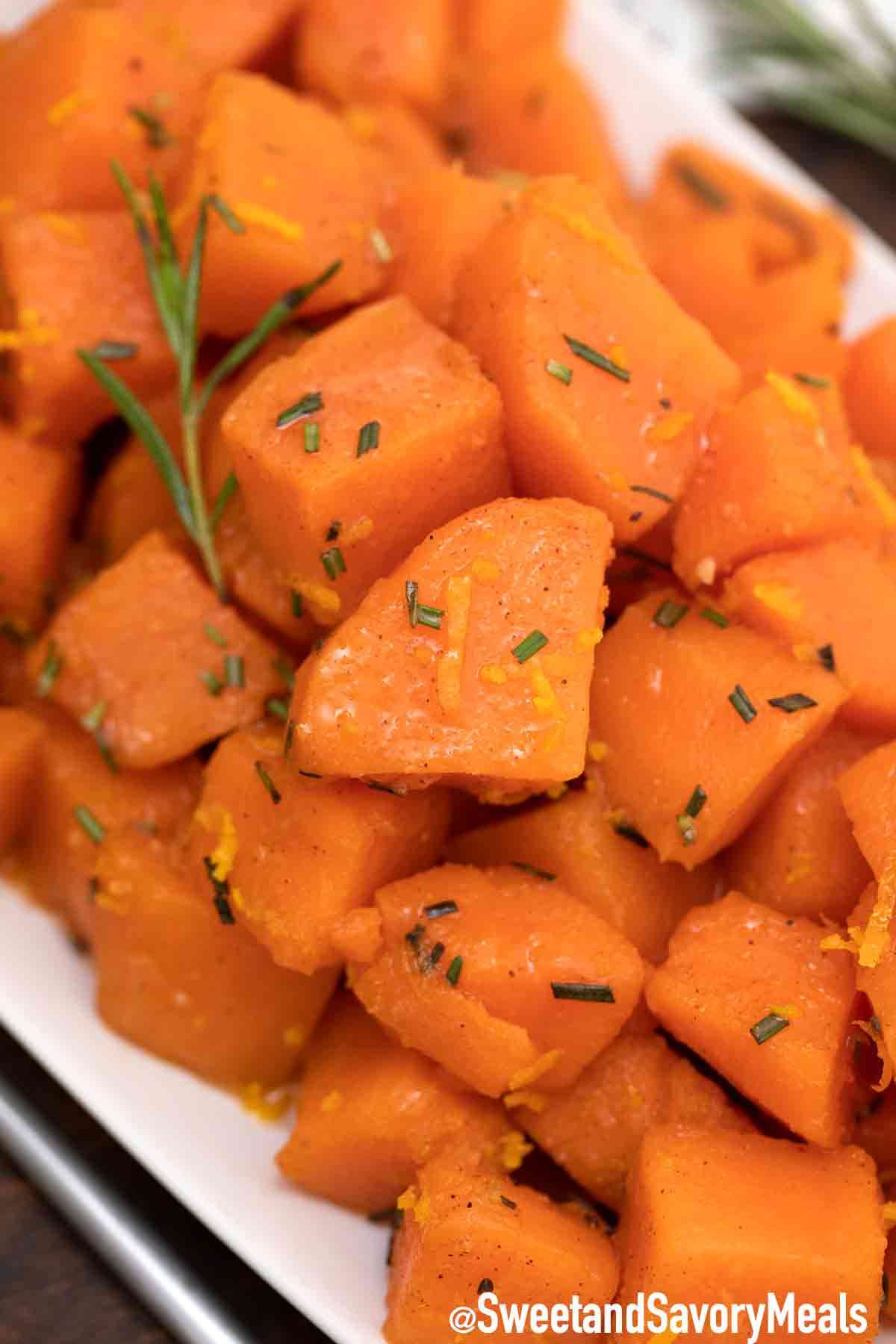 Brown Sugar Candied Yams are roasted in a butter-brown sugar sauce flavored with fresh orange zest, autumn spices, and fragrant rosemary.