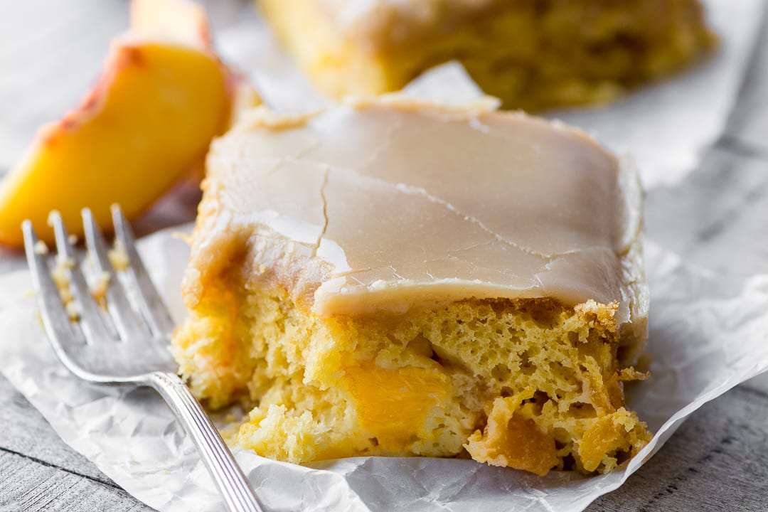 This Brown Sugar Peach Cake is a classic yellow cake loaded with fresh peaches, and topped with a brown sugar caramel icing ~ it's the dessert of the summer!