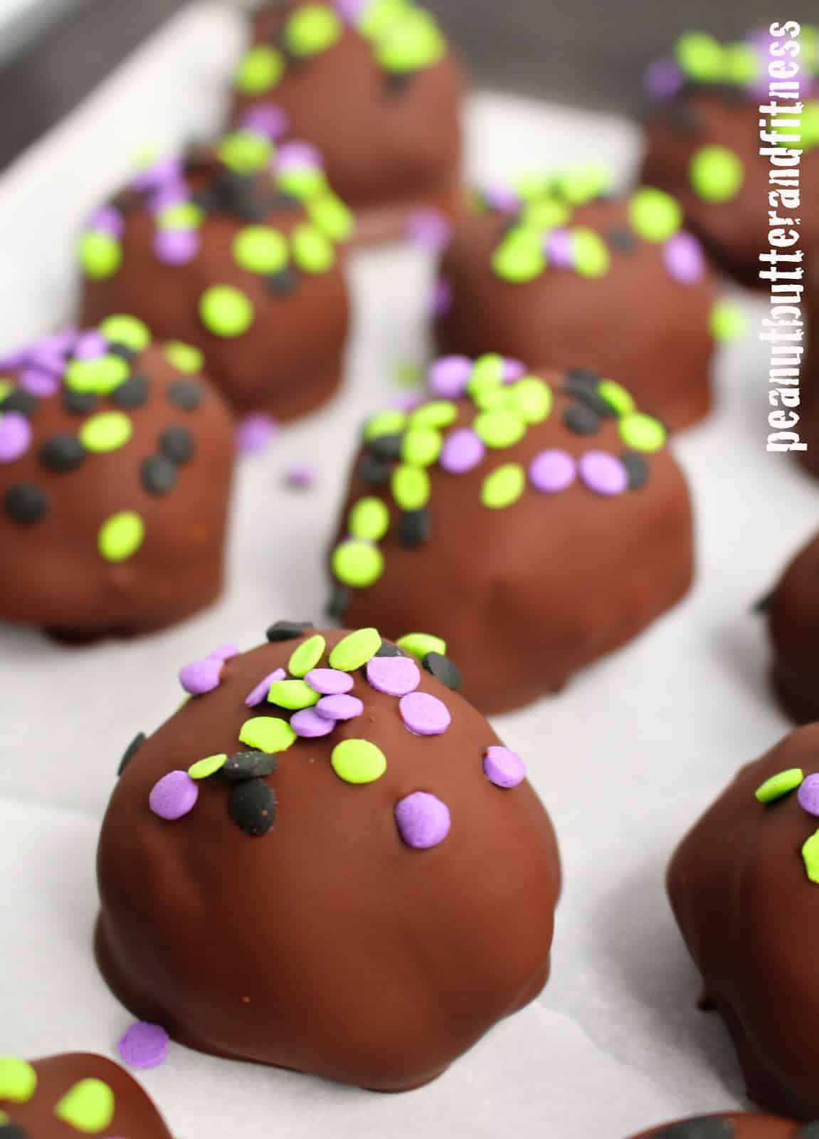 - Insert a toothpick into brownie batter balls and dip into chocolate until coated. Gently scrape any excess chocolate from the bottom of the truffle and place truffle on wax paper. Carefully twist toothpick to remove and top with sprinkles. Repeat process with all truffles.