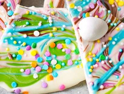 Rich, no bake white chocolate bark, swirled with milk chocolate brownie batter and decorated in fun Spring colors! This bark makes a perfect homemade gift!!