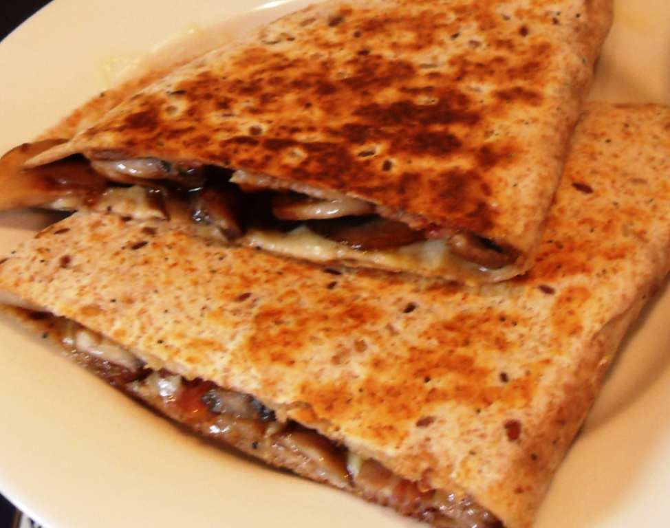 - Place the fillings on one side only, start with a layer of cheese, then a layer of bacon, a layer of mushroom and finish with another layer of cheese then drizzle the half the garlic oil over the top and fold tortilla in half.