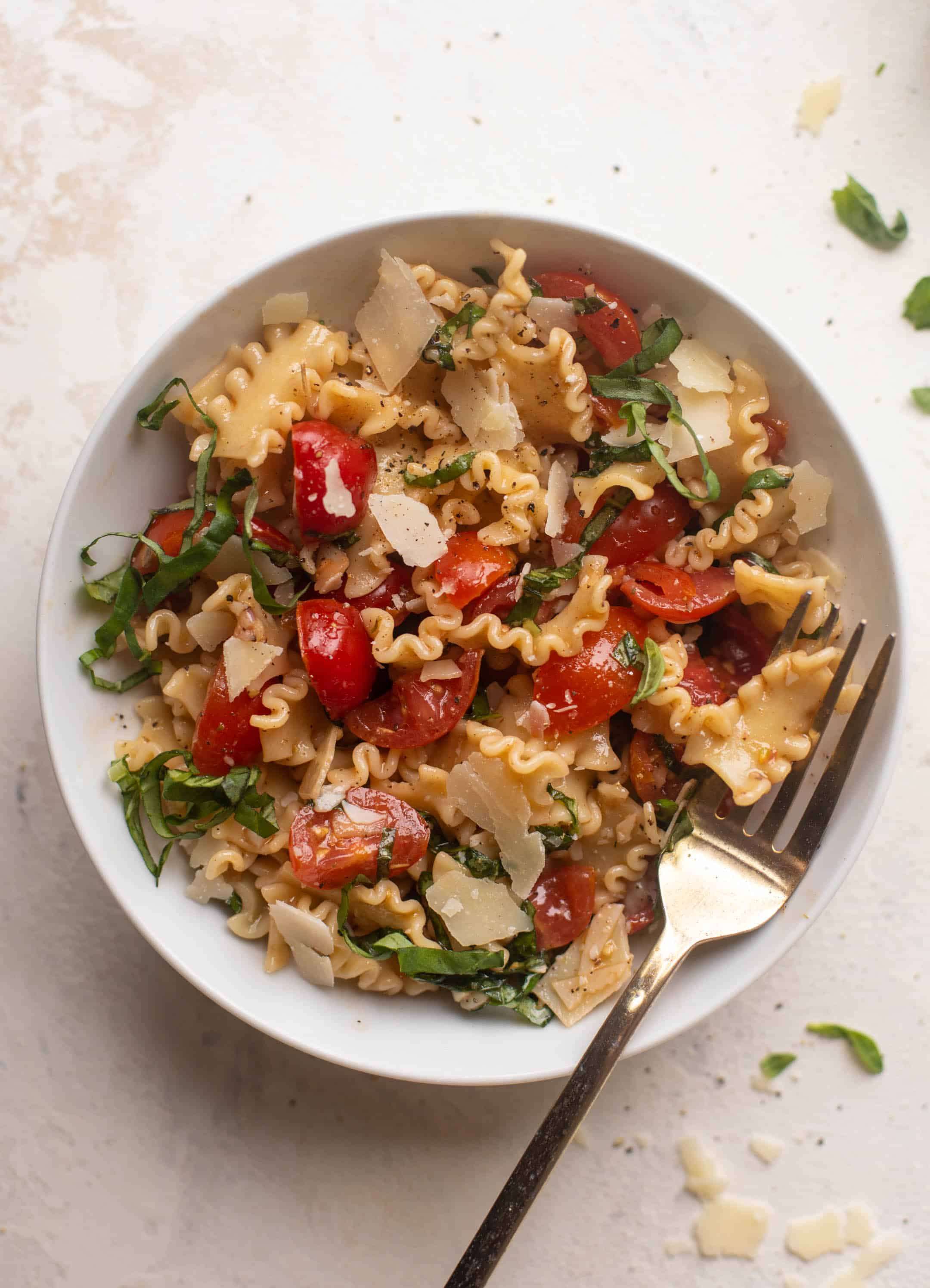 This bruschetta pasta salad is a summer staple! Juicy ripe tomatoes, fresh basil, shaved parmesan and the most delicious balsamic dressing. Serve immediately or make ahead of time and it's perfect. Ideal for a party or just great for dinner - a dish that goes with everything!