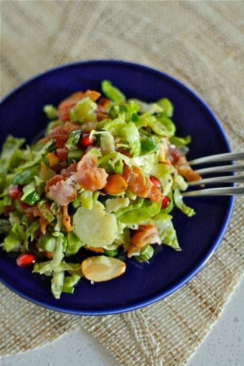- Remove from heat and stir in cooked bacon, pomegranate arils and toasted almonds. Toss and serve warm.