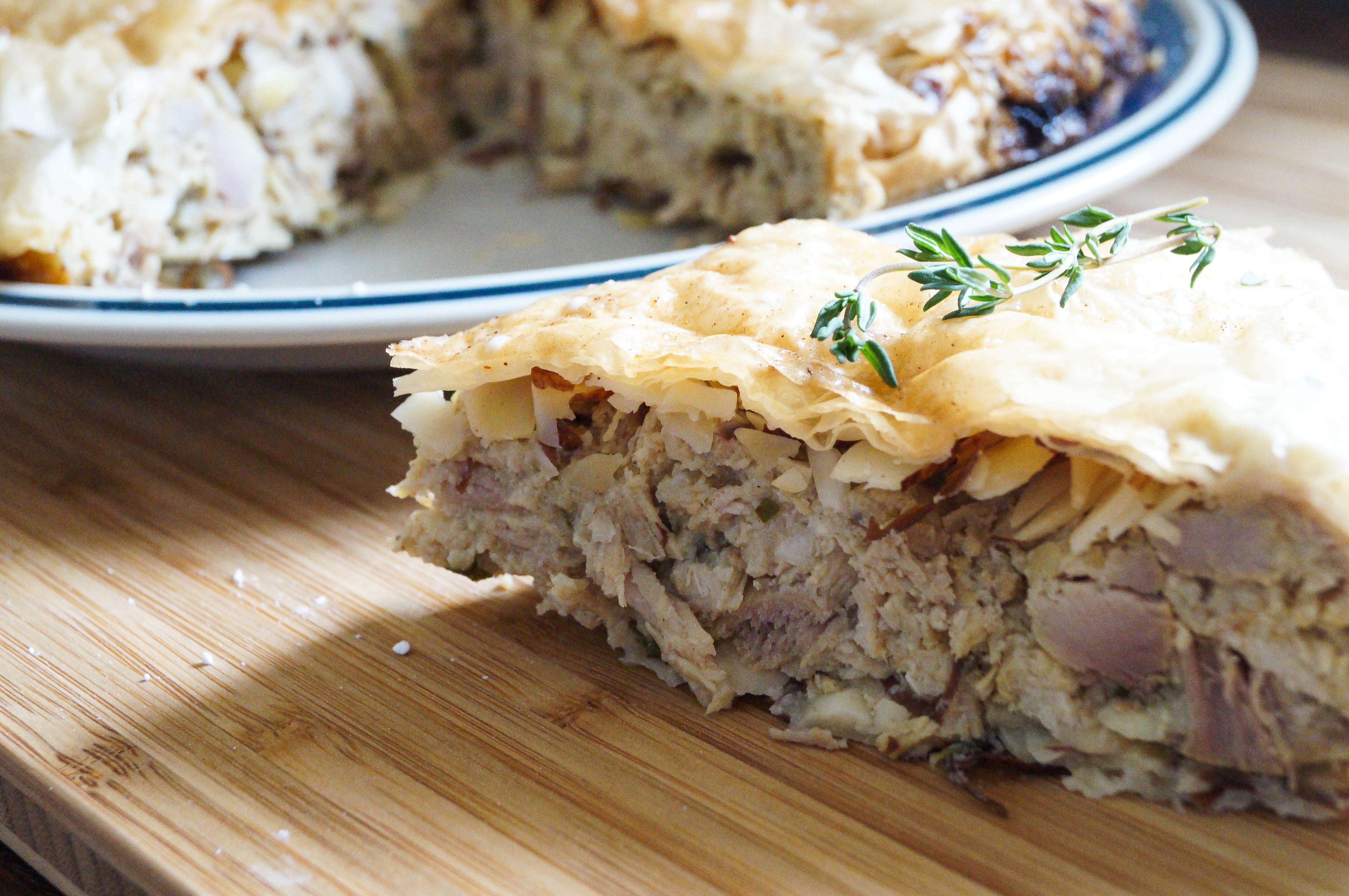 - Brush each remaining sheet of phyllo with butter, stacking them on top of each other on work surface. Use the bottom of a 10 inch pan to cut out a 10 inch circle from the phyllo. Place over the pie and carefully tuck the edges into the sides of the pan. Brush the top with butter and sprinkle with cinnamon sugar. Place the pan on the foil lined baking sheet. Bake in preheated oven for 20 minutes, decrease temperature to 350 degrees Fahrenheit, and bake for an additional 20 minutes. During baking, if the top becomes too brown, cover loosely with foil. Let rest 5 minutes and sprinkle with powdered sugar.