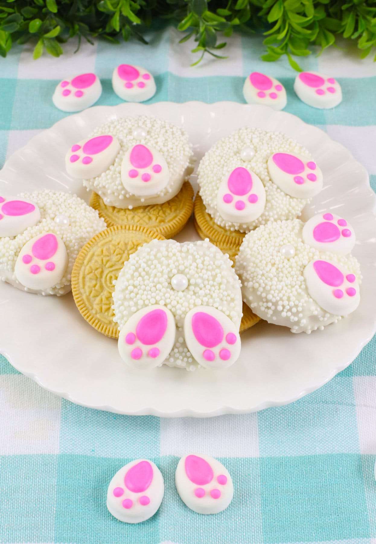 - Dip Oreo Cookies one at a time in the White Chocolate, covering one side of the Cookie, then dip immediately in the White Nonpareils, and lay on Parchment to set, with the dipped side up. Place the Bunny Feet on the cookies, and press gently to secure them in the Chocolate.