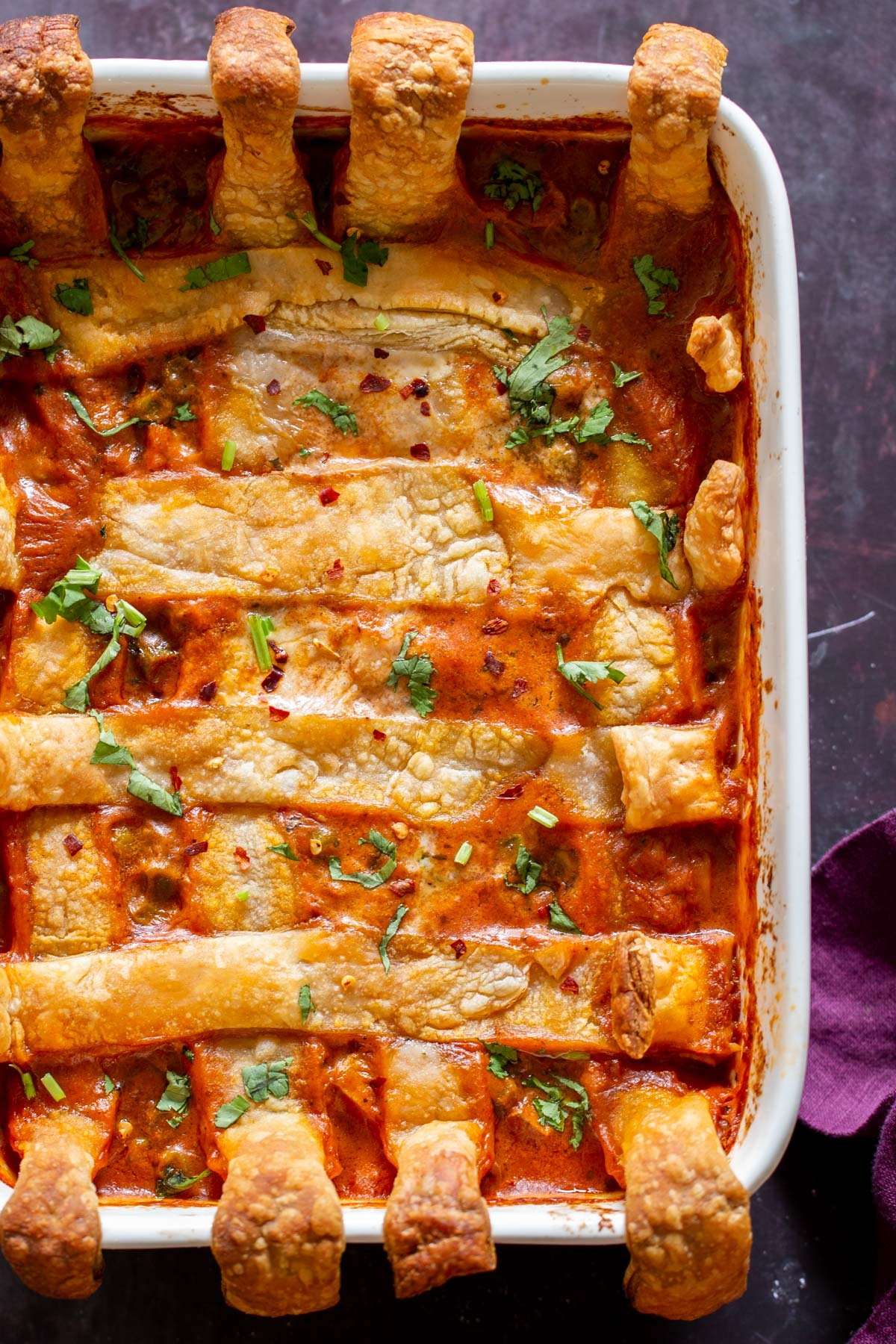 Pot pie but make it with an Indian twist! Veggies and tofu baked in butter chicken sauce and topped with puff pastry! Everything baked in the same pan. 2 step 15 min active time recipe. Butter Sauce Pot Pie is packed with vegetables and flavor. Nutfree, options for gluten-free and soyfree !
