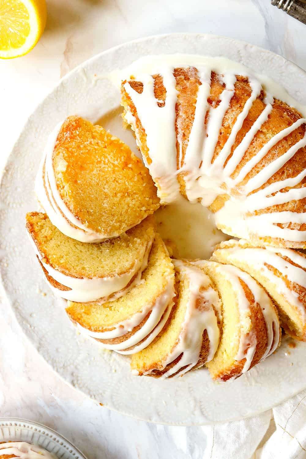 This lemon pound cake recipe is rich, buttery, tender and most importantly, packed with bright lemon flavor! It’s essentially a butter poke cake spiked with lemon juice and lemon zest in the batter then infused with luscious lemon butter syrup that soaks through the cake and finally it’s smothered with an irresistible cream cheese lemon glaze. This tender lemon Bundt cake is easy to make and tastes even better the next day – perfect for stress free entertaining or holidays (like Easter!). Tips and tricks, Step-by-Step Photos, How to Make Ahead, How to Freeze all included!