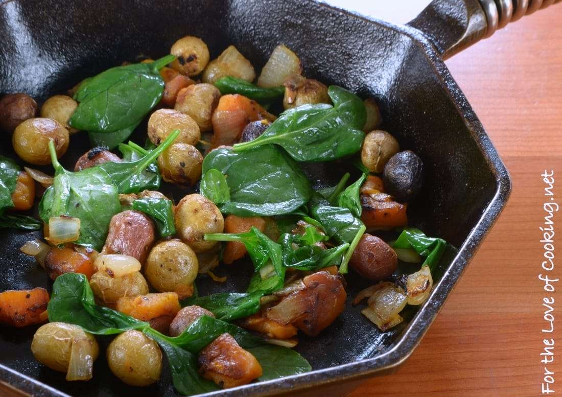 - Remove from the oven and add the spinach to the skillet, stirring gently for a minute or two, until wilted.