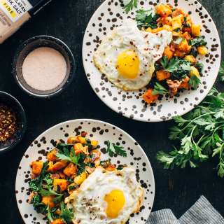- Serve the butternut squash and baby potato hash in a bowl topped with the poached egg.