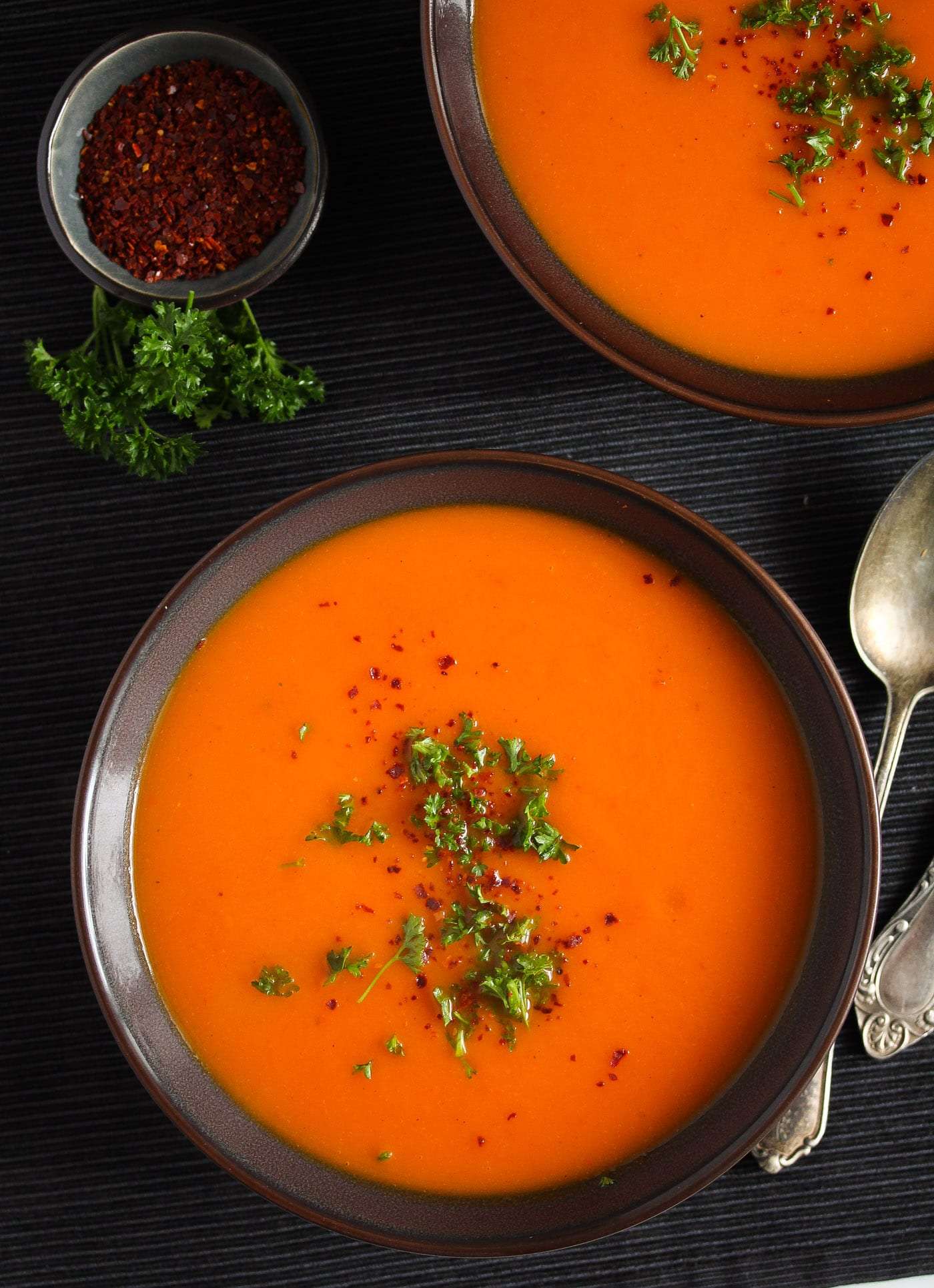 Vibrant butternut squash and red pepper soup made with roasted vegetables. A super-easy to make, cozy winter soup.