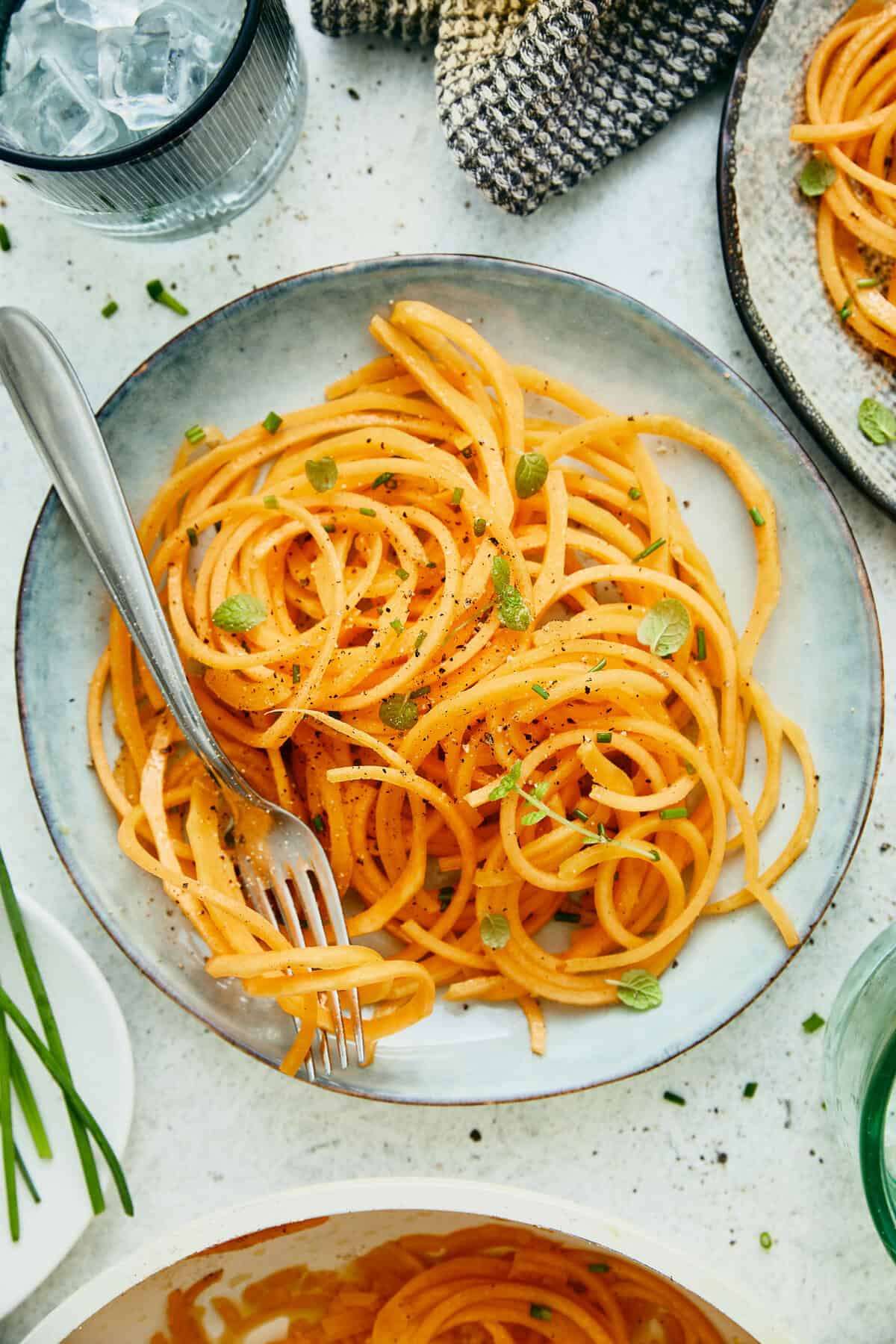 - Add the spiralized butternut squash noodles to the skillet, season with sea salt and black pepper, and sauté for 7-10 minutes until tender but still al dente.