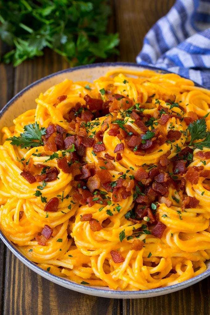 This recipe for butternut squash pasta is spaghetti tossed in a creamy butternut squash sauce, then topped with bacon and herbs. An easy and delicious dinner that's perfect for fall!