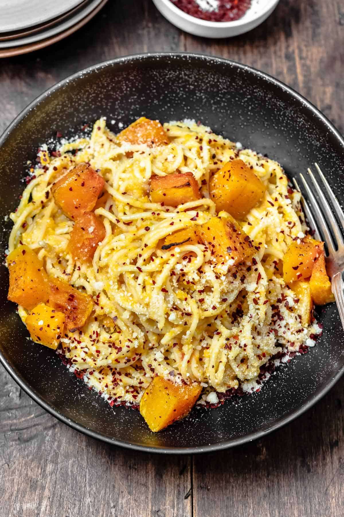 - Finish the dish. Add the pasta to the butternut squash sauce. Stir to combine and finish with more cheese if you like. Stir in the reserved roasted squash pieces. Divide the pasta among your friends and family and enjoy!