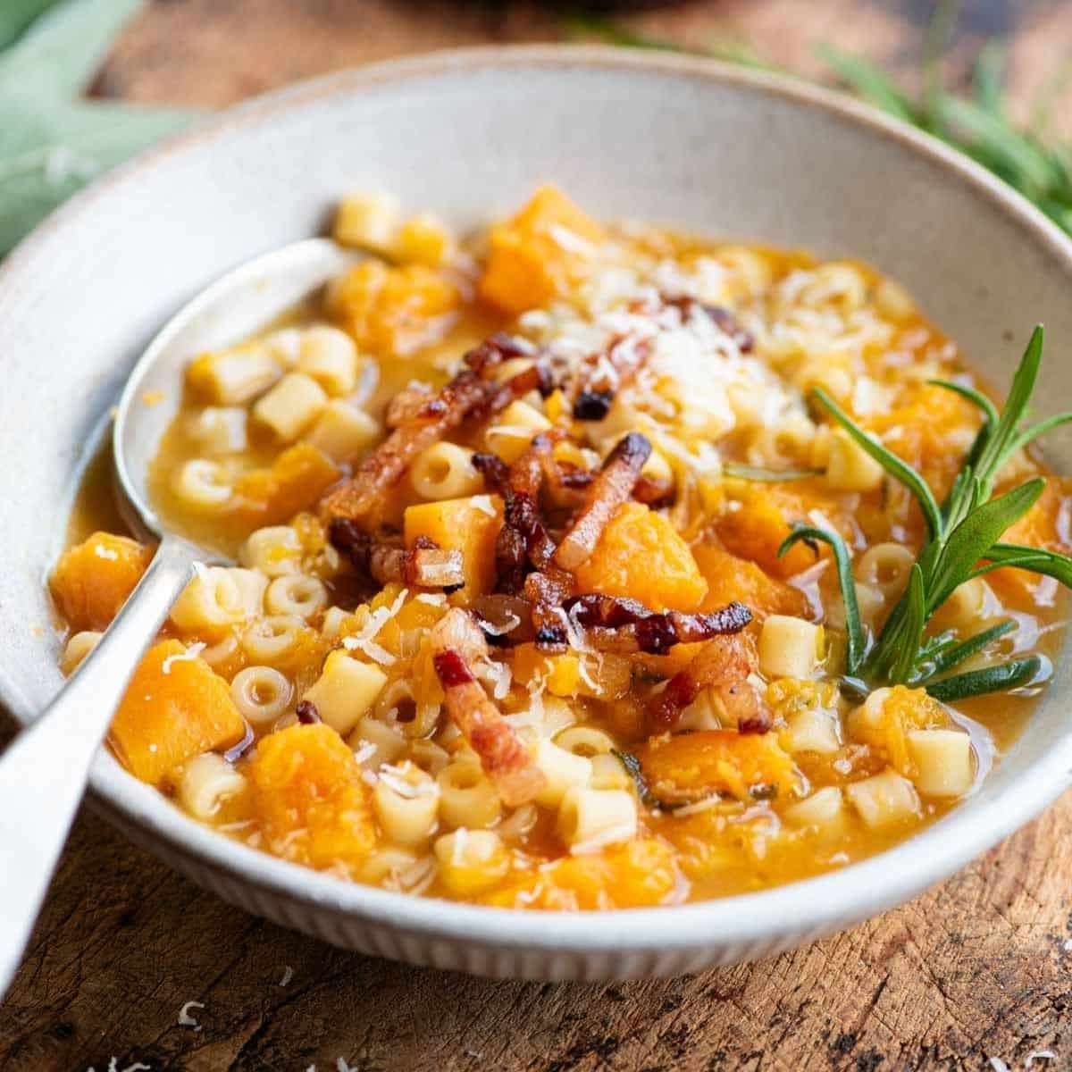 A cosy and comforting pasta soup made with butternut squash, rosemary, sage and crispy pancetta. This soup is super easy to make and is bursting with Fall flavours, perfect for a cosy night in.