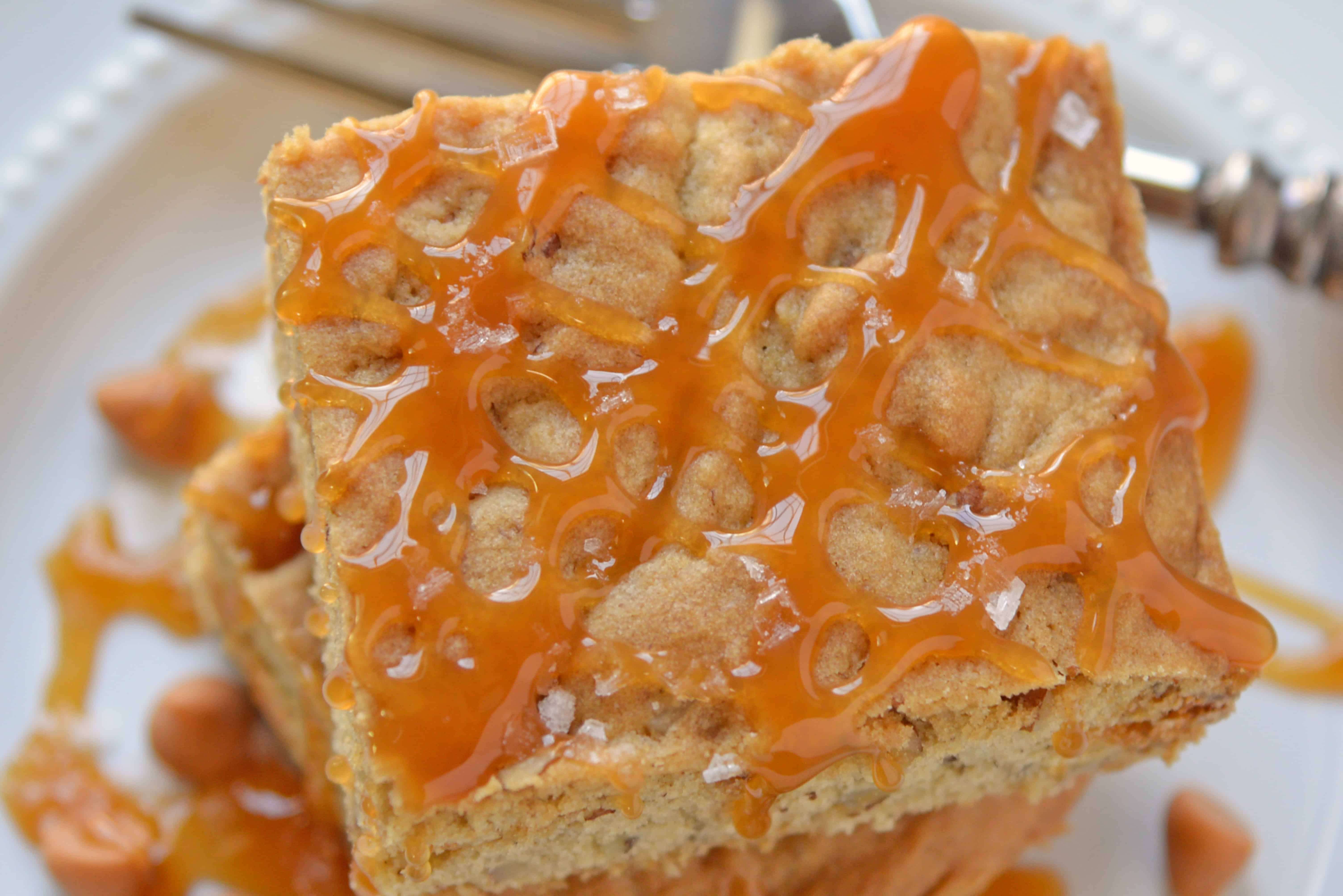 Butterscotch Blondies are soft brown butter brownies loaded with butterscotch chips and drizzled with salted caramel sauce.