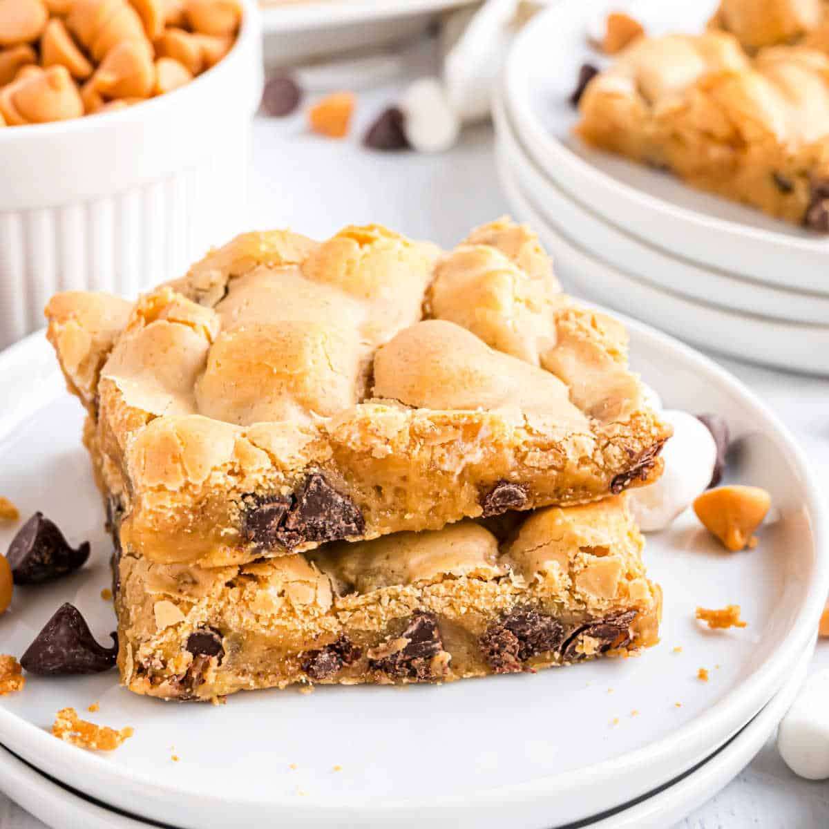 Chewy, sweet Butterscotch Marshmallow Bars. Packed with brown sugar, butterscotch, chocolate chips and marshmallow, it's like a s'mores dessert!
