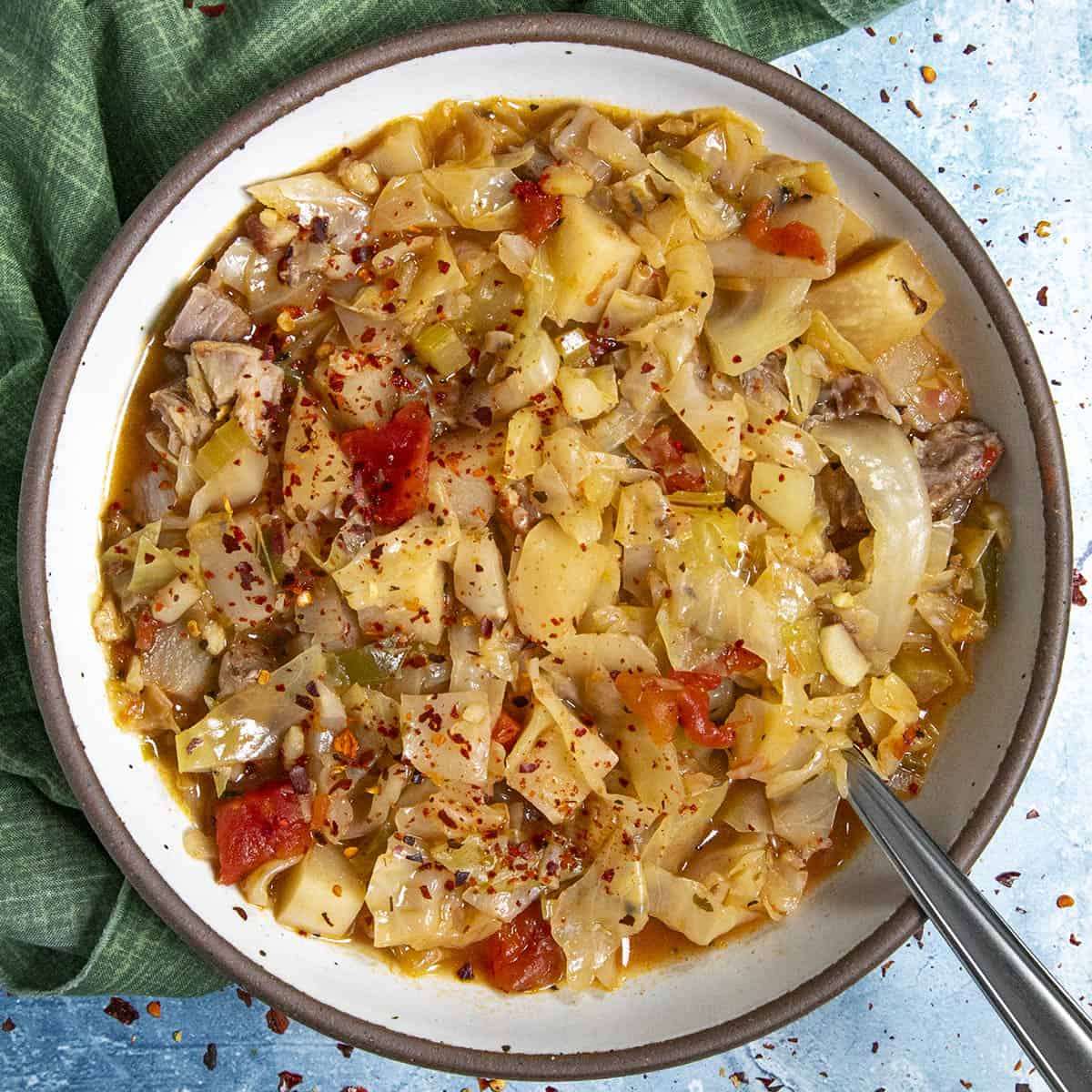 This rustic cabbage soup recipe is loaded with flavor with lots of tender cabbage simmered with ham hocks, fire roasted tomatoes, and warming spices.