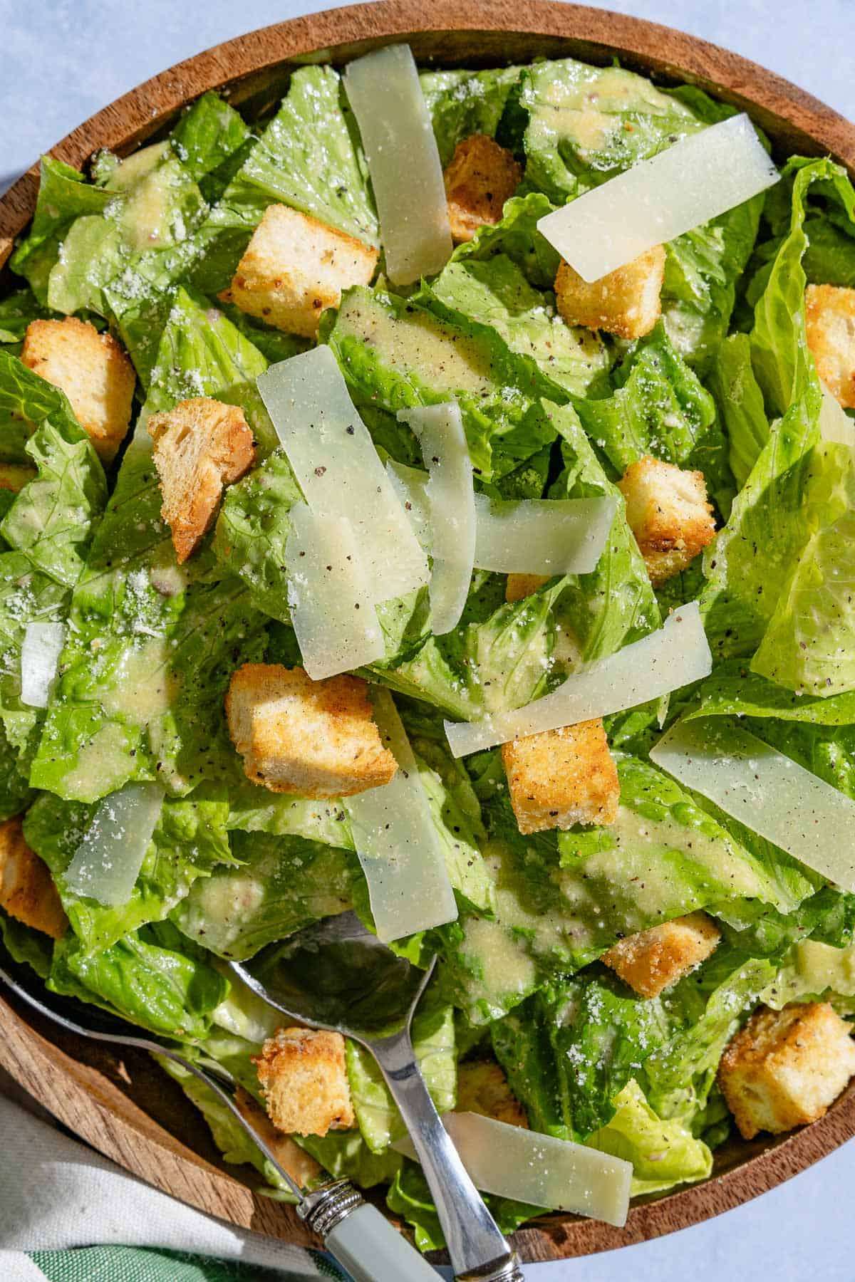 - Make the Salad: In a large serving bowl, add the chopped romaine lettuce, layering it with the dressing. Use salad servers to toss the lettuce in the dressing until coated evenly. Top with the croutons and extra grated parmesan or parmesan shavings. Serve immediately.