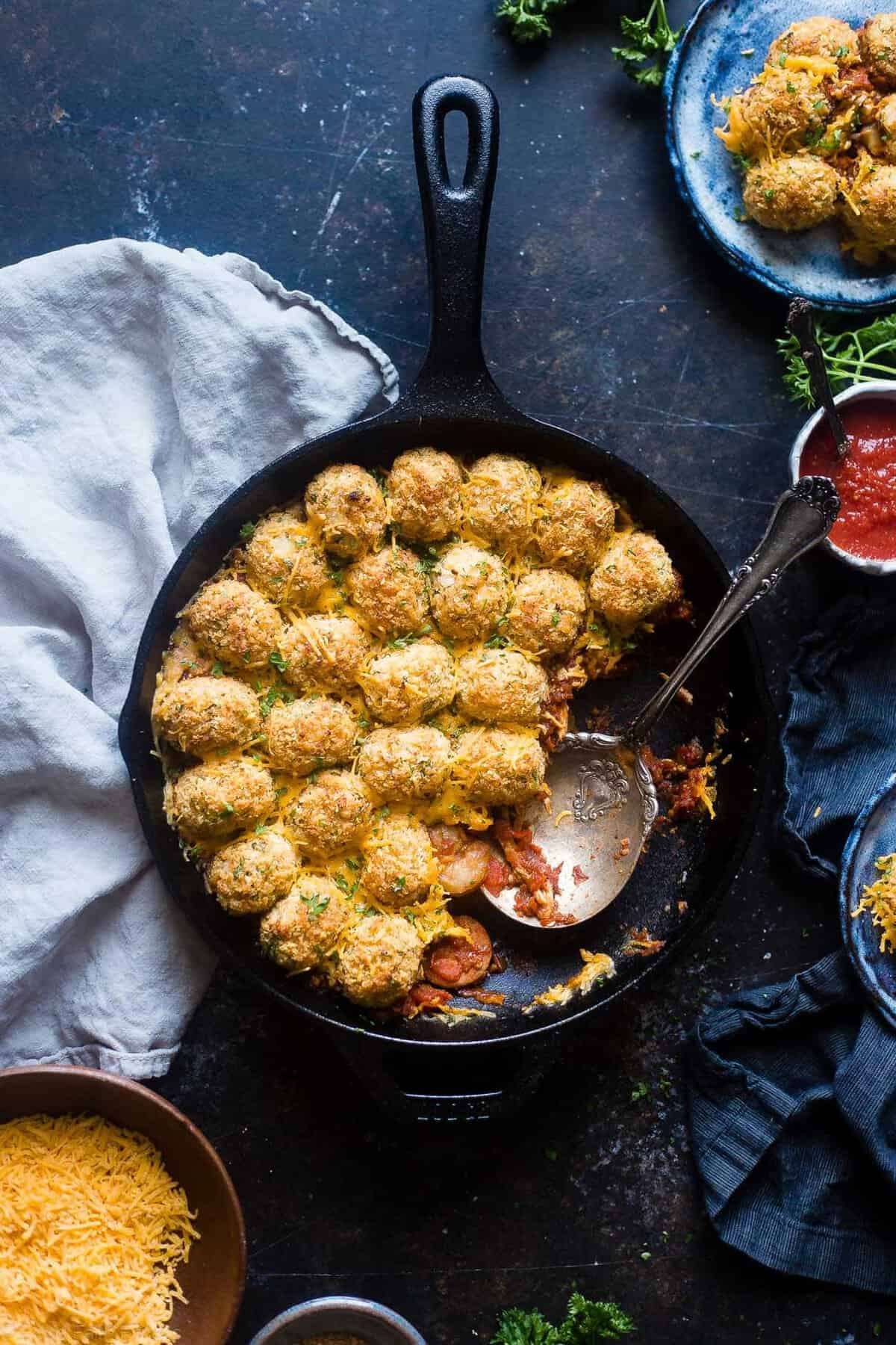 - Spread the tomato mixture evenly in the bottom of the pan. Then, sprinkle 1/2 cup of the cheese evenly over top. Place the cauliflower tots on top of the tomato mixture, followed by the remaining cheese.
