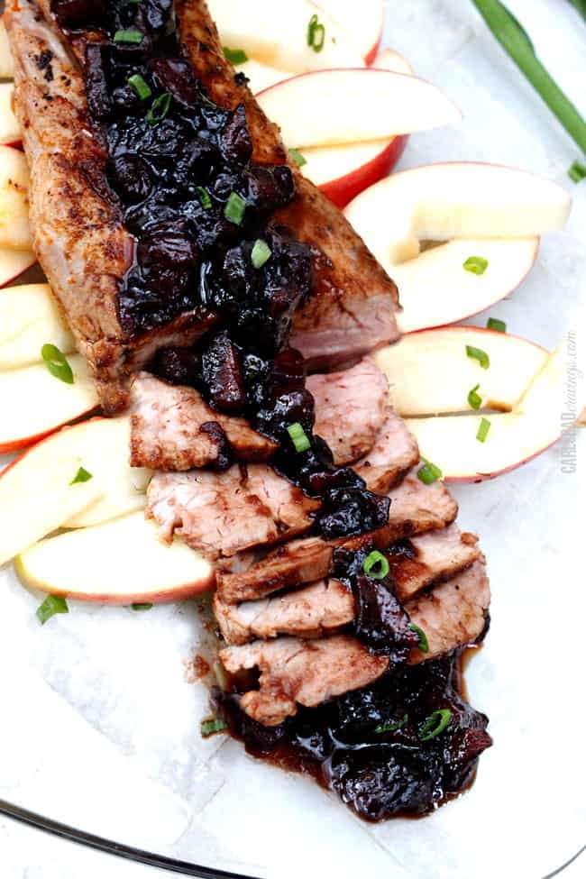 - To serve, slice tenderloin into thin slices and spoon Cranberry Apple Balsamic Reduction over top. Garnish with green onions (optional).
